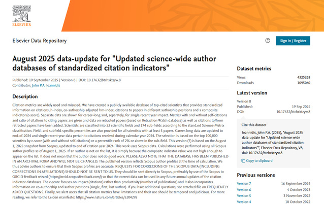 该数据集基于Science-Metrix 分类方法,遴选依据Scopus Author Profile(学者档案),并采用C-Score指标(包含自引与不包含自引两种情况)选取全球排名前10万,或在各子学科领域中百分位排名达到2%及以上的学者。